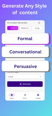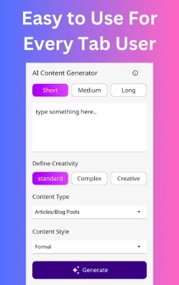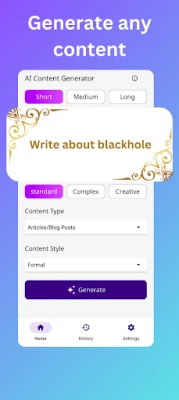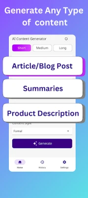 Unlock your creativity with the AI Content Generator, the perfect app for generating high-quality content quickly and effortlessly. Whether you're a student, writer, marketer, or entrepreneur, this powerful tool helps you create engaging articles, social media posts, blogs, and more in an instant.