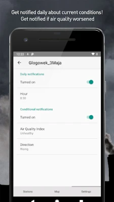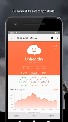 On the screen of the station details, thanks to clear look, at first glance you will see the condition of the air, you'll be able to check the quality index and the current weather conditions that prevail in your area. Quickly check the readings of individual sensors and, using easy to read elements, you can check what percentage of standards they meet. What's more, you'll be able to see the state of the sensors over the last 24 hours laid out in a beautiful chart. In addition, a small map view will allow you to view the air quality in stations nearby.